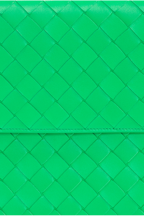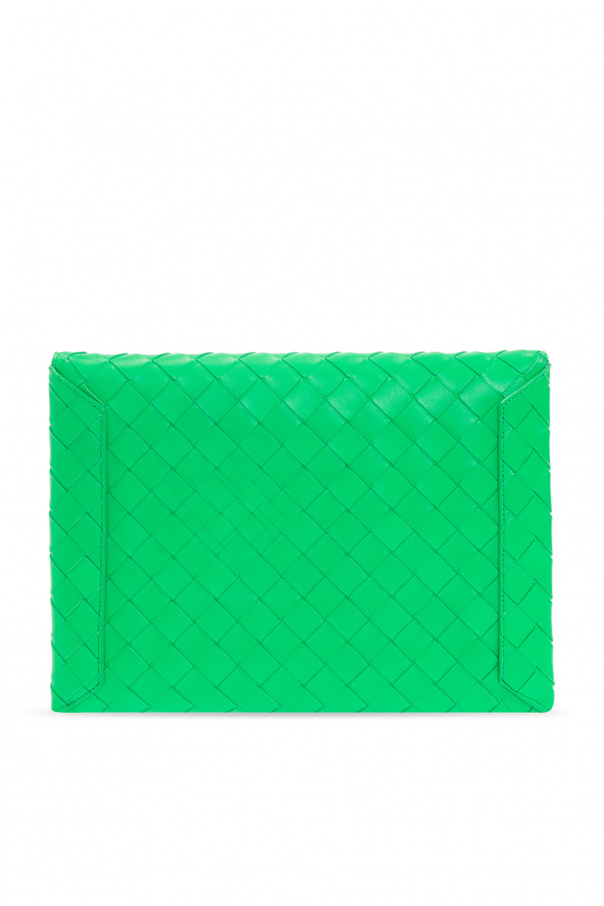 Green ‘Flap’ clutch from Bottega Veneta. Fastened with a magnetic closure, this item features the label’s signature Intrecciato weave and one internal compartment with one slip pocket and six card slots.