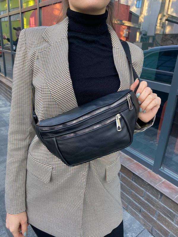 Кожаная бананка отличный вариант для кожного дня, ведь натуральная кожа долговечна два варианта на выбор: - серебряная молния - Черная молния • Сумка сделана из качественной натуральной кожи • Имеет 2 кармана: одну большую и меньшую сзади • Размер: 29x16x6 см • Максимальный объем - 125 см • Ремень регулируется по длине • Сумка держит форму • Внутри подкладка