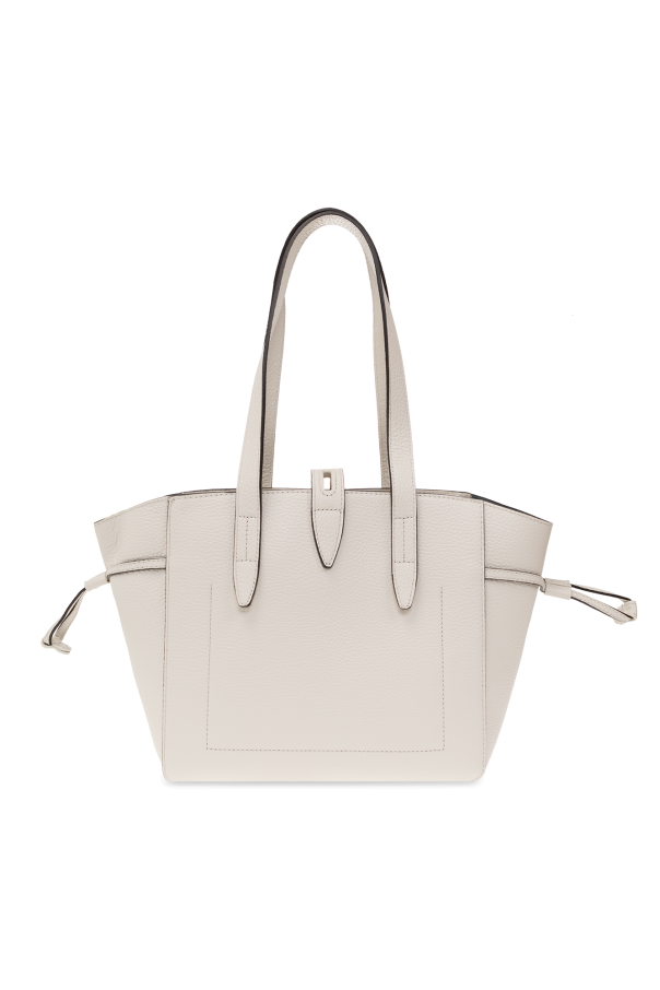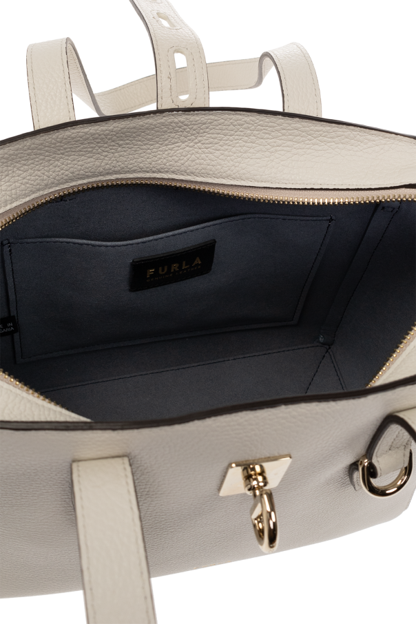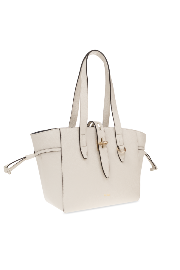 Light grey ‘Net Small’ shopper bag from Furla. Crafted from leather, this design secures with a zipper and logo-engraved twist adjuster and features drawstring detailing on the sides, two half-round straps, gold-tone metal hardware and one internal compartment with a slip pocket.