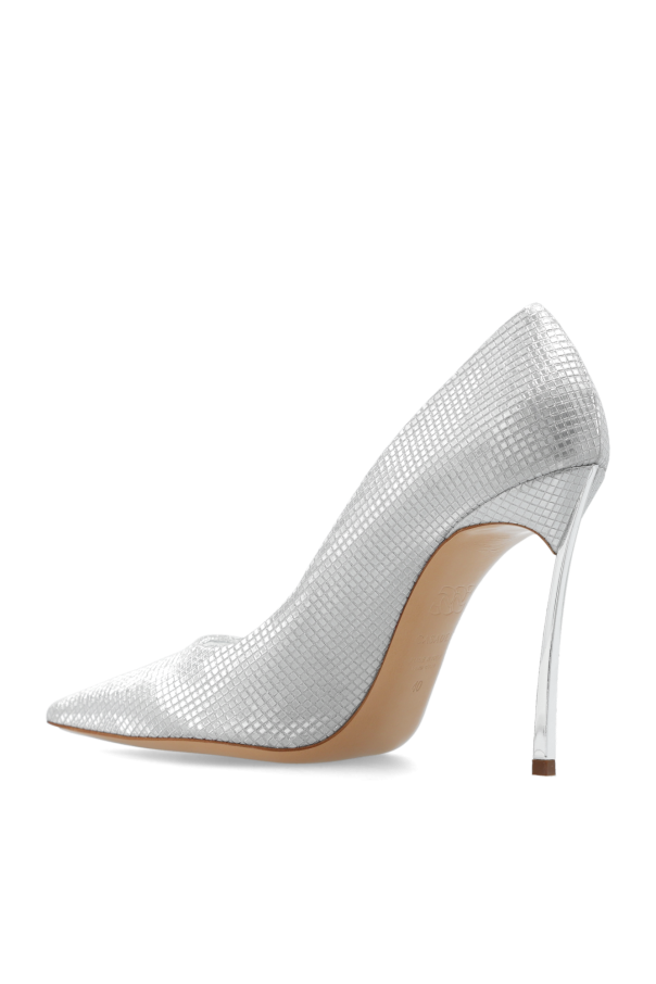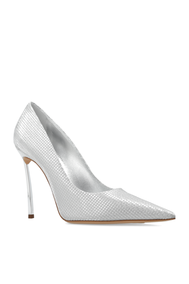 Silver-tone ‘Superblade Diadema’ stiletto pumps from Casadei. Set on the brand’s signature stainless steel heel and beige leather sole, this pair features a pointed toe and a metallic finish.