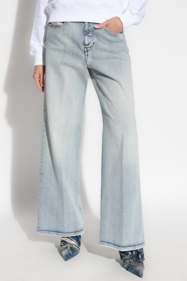 Light blue ‘D-AKEMI L.30’ jeans from Diesel. Crafted with a vintage effect, this pair falls with flared legs and features a zip fly with a button, classic five pockets and logo patches on the front and back.