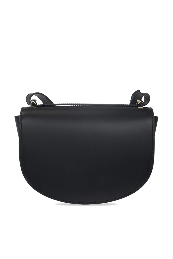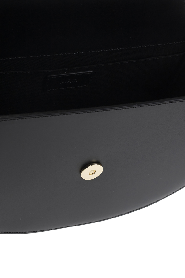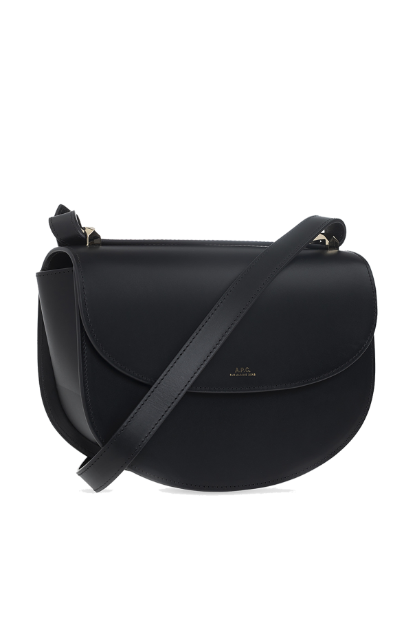 Black ‘Geneve’ shoulder bag from A.P.C. Made of cow leather, this model features a magnetic snap, embossed logo pattern in gold-tone, adjustable strap, silver-tone metal hardware and one internal compartment with one slip pocket.