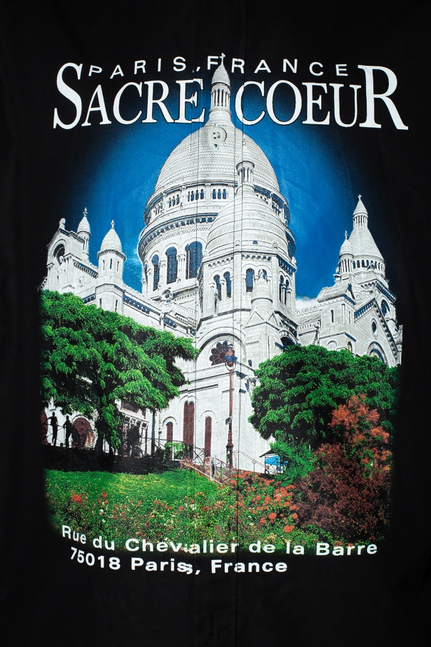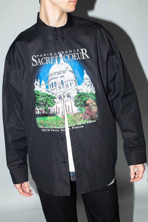 Black shirt from Balenciaga. Crafted from cotton, this long sleeve design features button fastenings and a colorful printed logo pattern.
