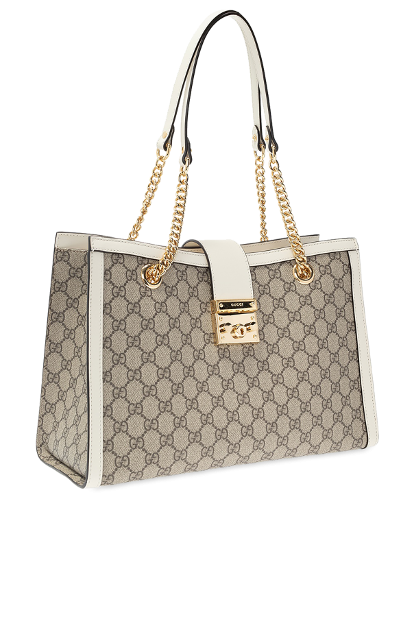 Beige, brown and cream ‘Padlock GG’ shoulder bag from Gucci. Size medium. Made of the brand’s signature GG Supreme canvas with leather trims, this model features a decorative closure, two half-round straps braided with a chain, gold-tone metal hardware and one internal compartment with one zip pocket and two slip pockets.