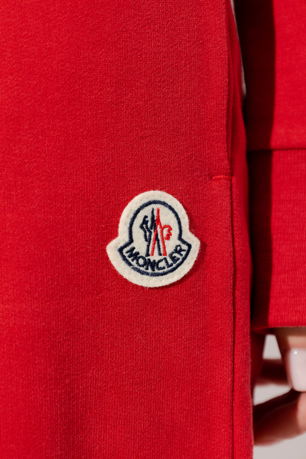 Red sweatpants from Moncler. Made of cotton, this pair features an elastic drawstring waistband, a logo patch, two printed stripes in white, two front pockets, two snap-fastened back pockets and ribbed cuffs.