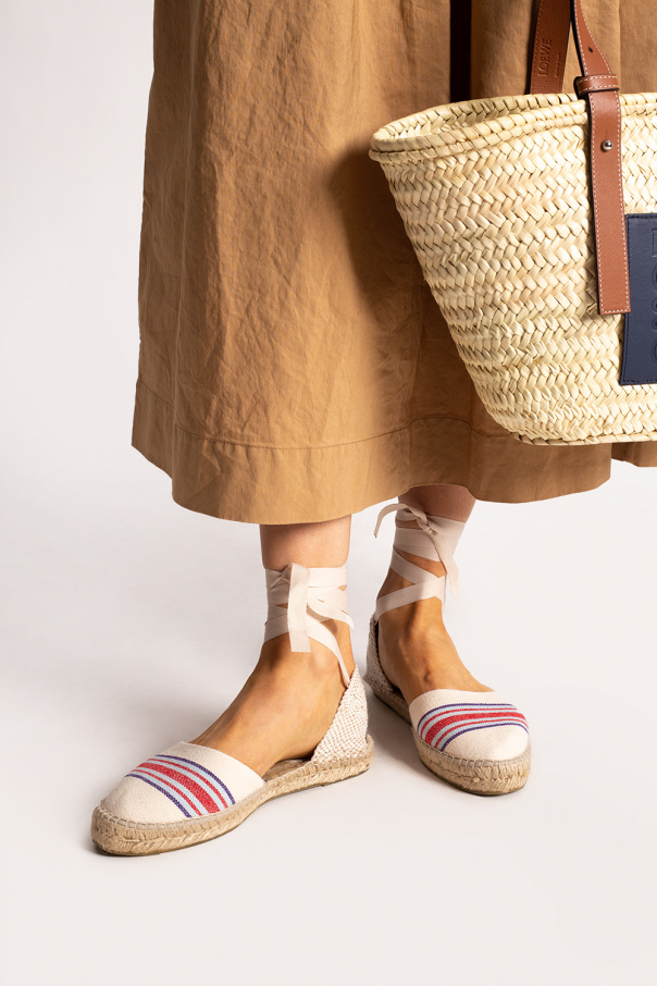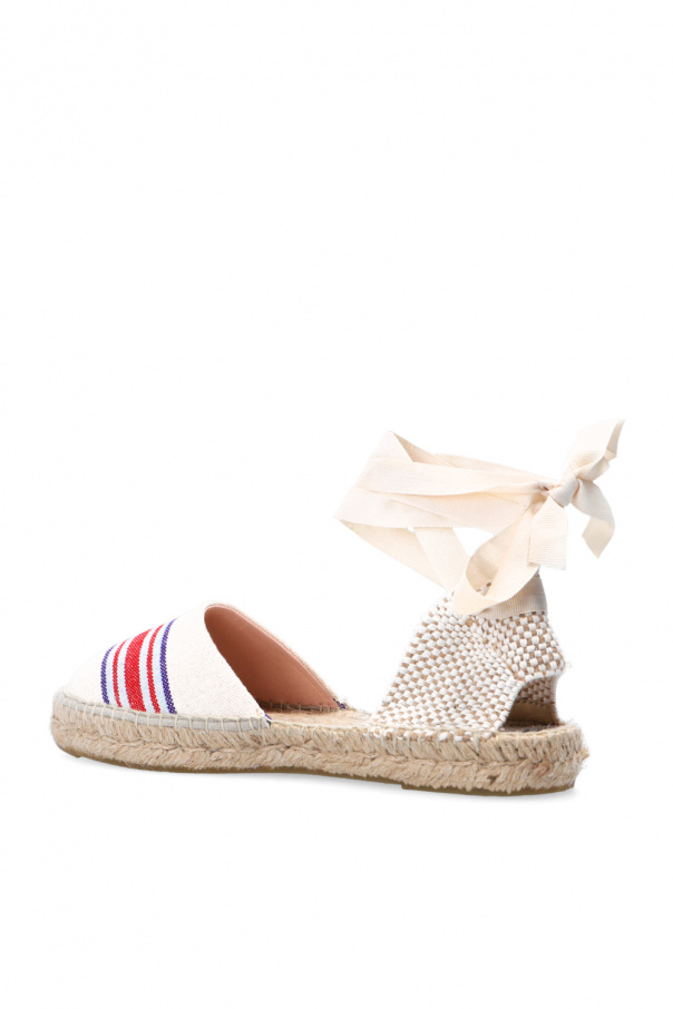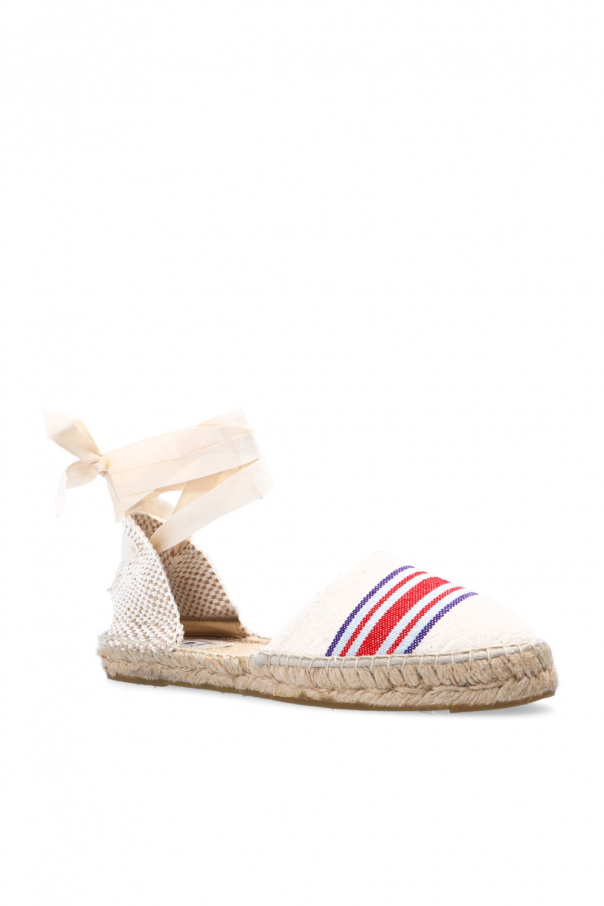Cream ‘Hamptons’ espadrilles from Manebi. Embellished with red, blue and purple stripes, this cotton-crafted pair sits on a beige rubber sole and features a beige grosgrain ribbon tie fastening at the ankle and a platform trimmed in natural jute in cream.