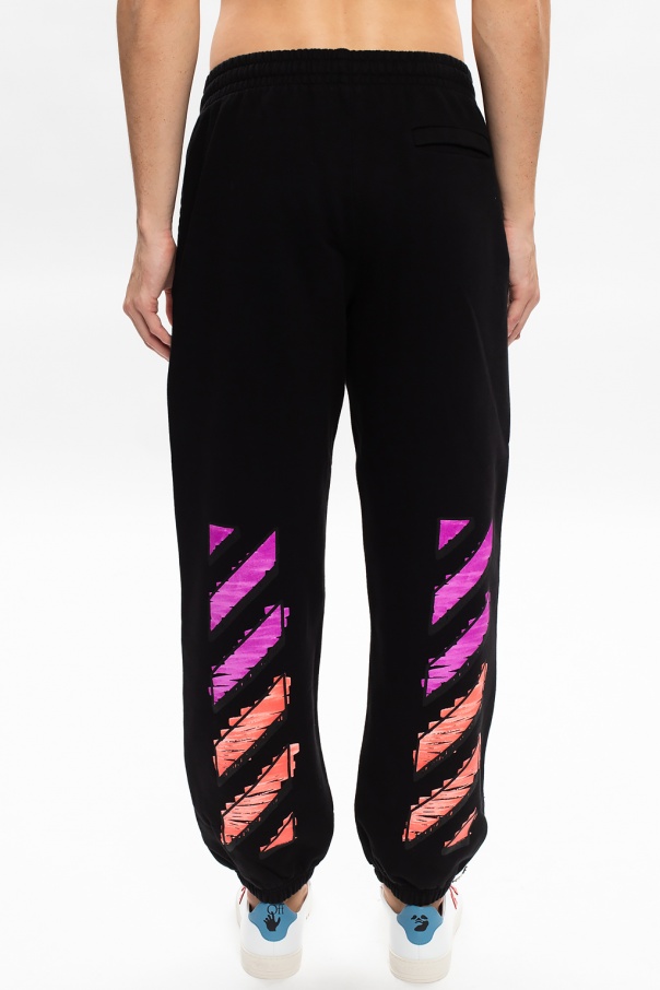 Black sweatpants from Off-White. Crafted from cotton, this design features drawstrings, a printed logo pattern in white, two front slip pockets, a rear velcro pocket and ribbed cuffs.
