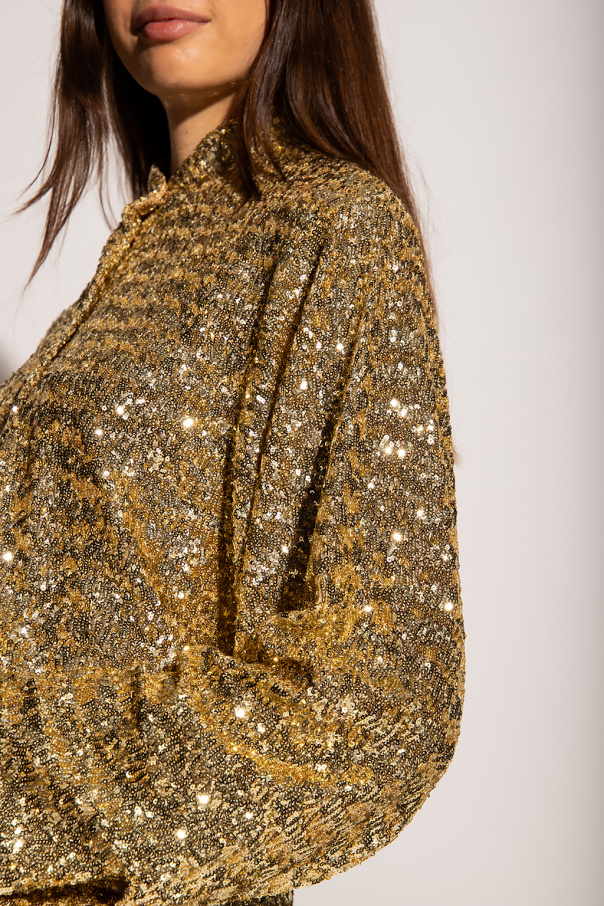 Gold-tone shirt with a band collar from Oseree. Fastened with hooks, this garment is embellished with sequins and has long sleeves with slits.