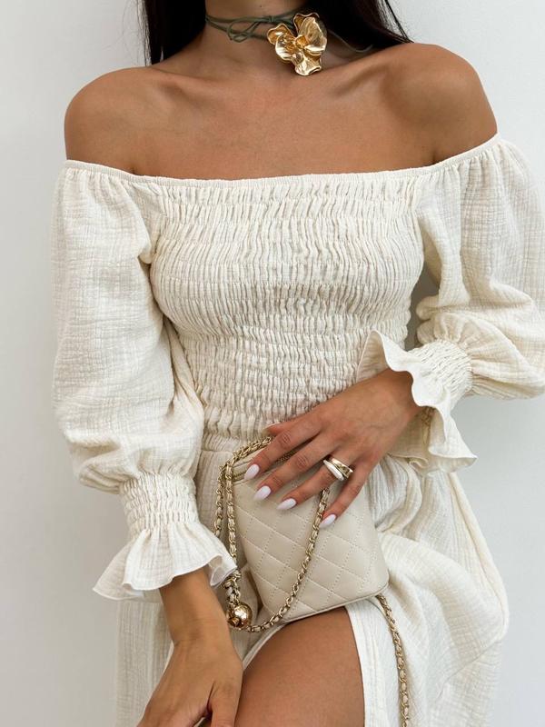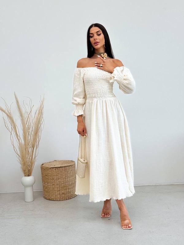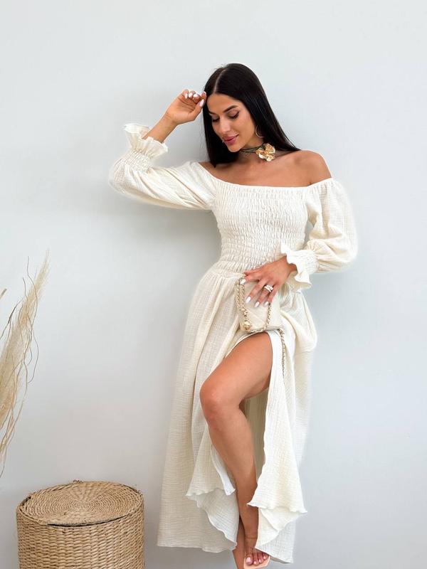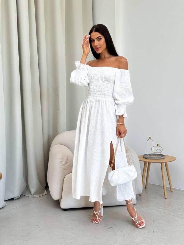 Нежное хлопковое платье 🕊 Модель 7030 ▫Ткань: лен-муслин, хлопок 100% ▫Размерный ряд: 42-46, 48-52 ▫Цвета: беж и молоко 1467 ФОТО РЕАЛ Идеальное легкое платье на резиночке, с разрезом на ноге🥰 Идеально подойдет под любую обувь, очень легкая и удобная 💌 Можно носить с закрытым и вскрытым плечом🌸 Под загоревшие ножки - именно то 🌞