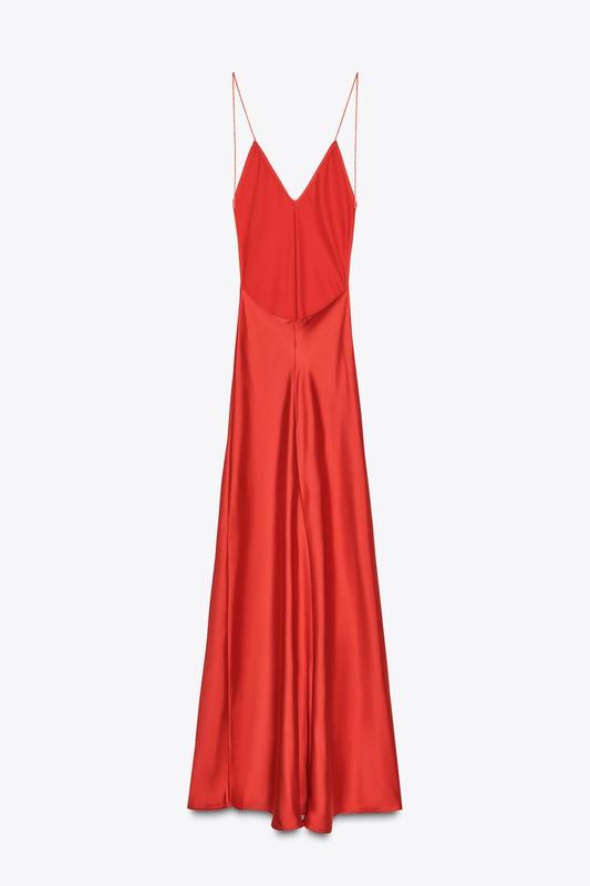 Длинное платье из атласной ткани. V-образный вырез и тонкие бретели. Открытая спина. Алый | 3067/213/632