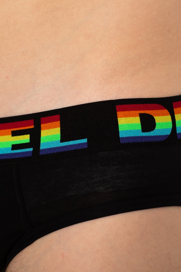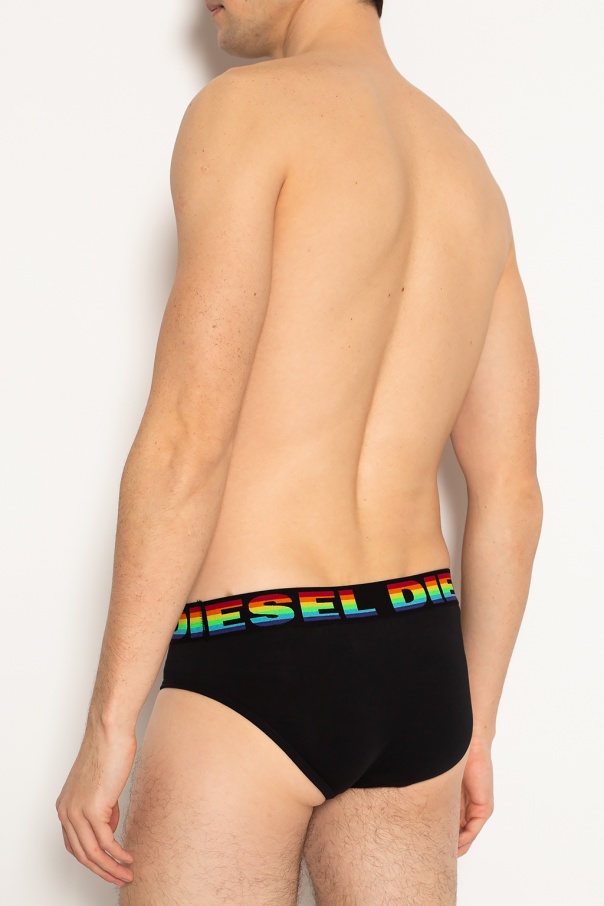 Black briefs three-pack from Diesel. Crafted from cotton, each item features an elasticated waistband with a colourful logo embroidery.