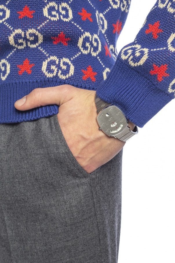 Silver-tone ‘Grip’ quartz watch from Gucci. Made of stainless steel. Decorated with an embossed logo. Waterproof up to 30m.