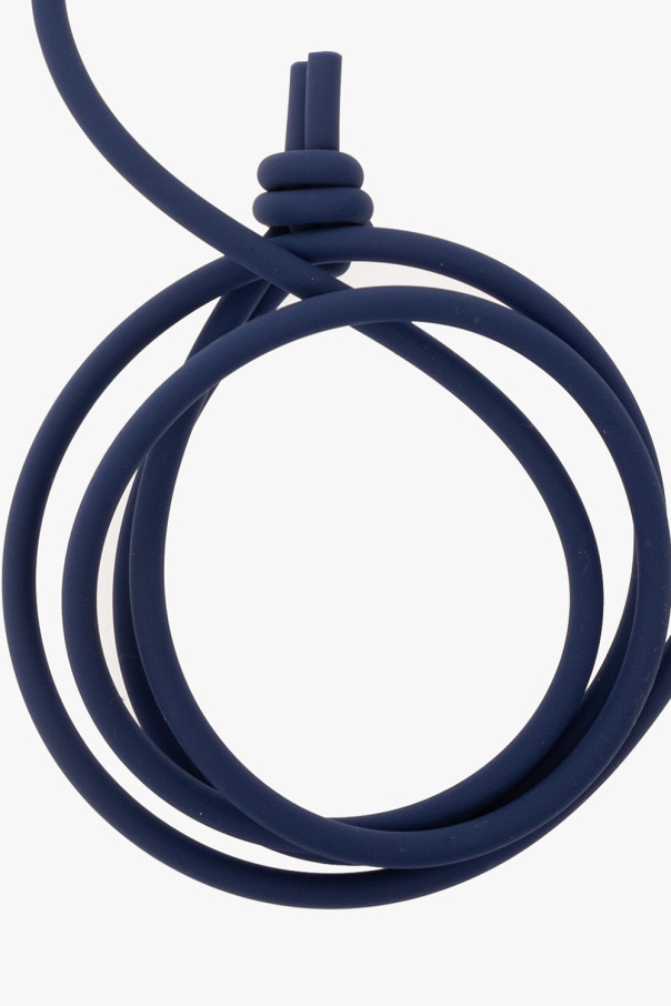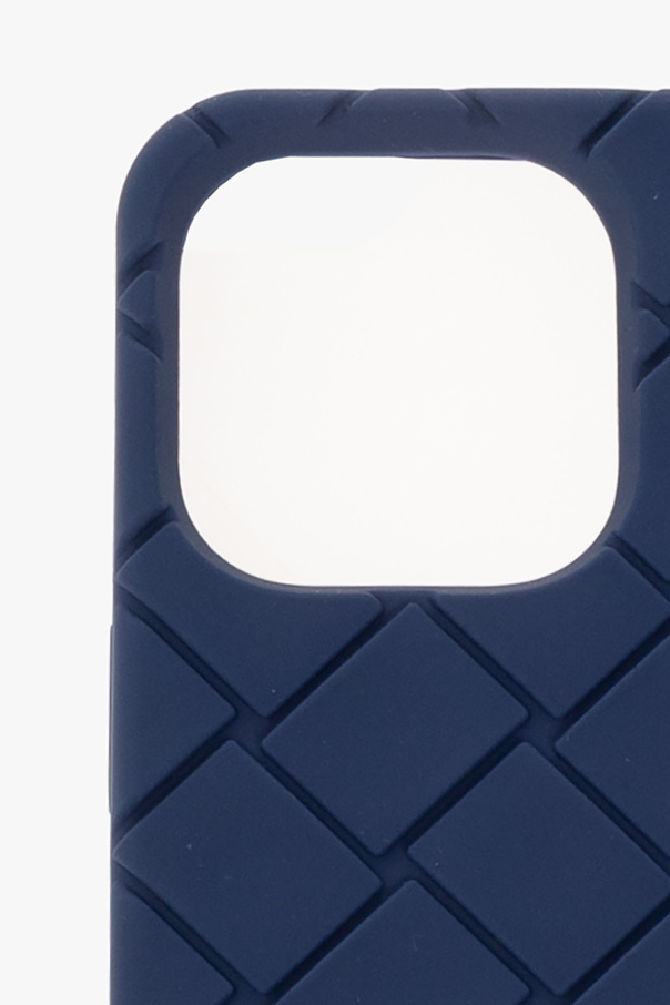 Navy blue iPhone 14 Pro case from Bottega Veneta. Made of silicone, this item comes with a strap and showcases the brand\'s signature ‘Intreccio’ motif.