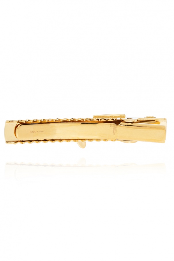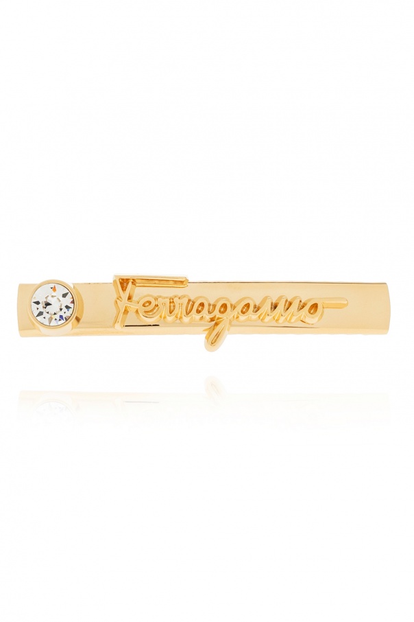 Gold-tone hairclip from Salvatore Ferragamo. Made out of brass, this sparkling hair accessory was embellished with raised logo detail and a glistening crystal.
