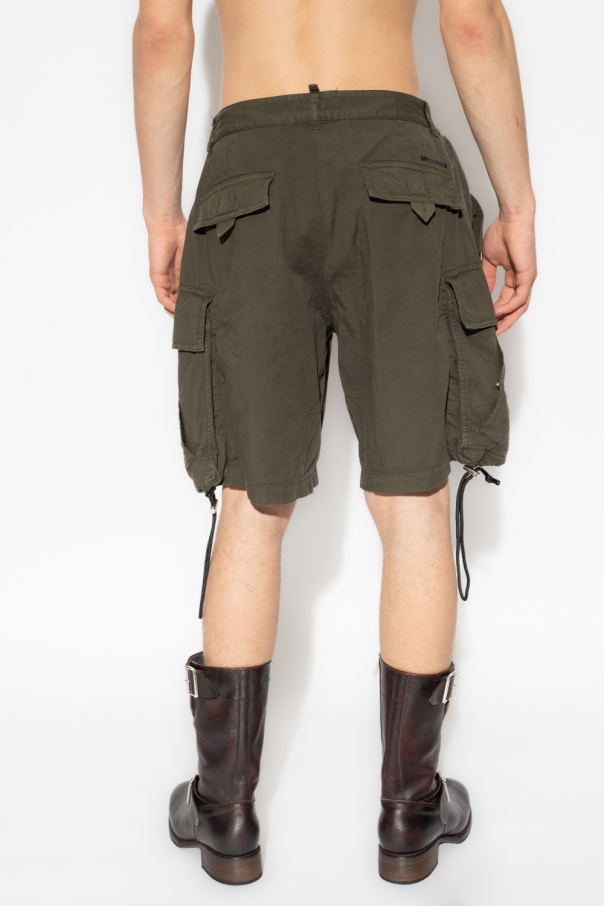 Dark green cargo shorts from Dsquared2. Made of cotton, this pair features a button and zip fastening, elastic waistband, black logo detail at the back, multiple pockets and drawstrings.