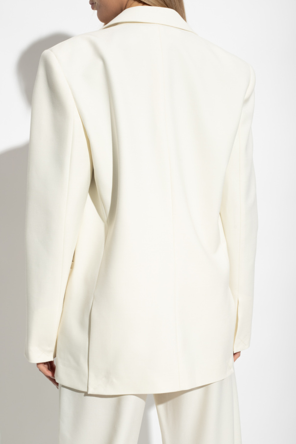 Cream single-breasted blazer from Off-White. Fastened with buttons, this design features peak lapels, padded shoulders, three slip pockets and long sleeves with a logo embroidery.