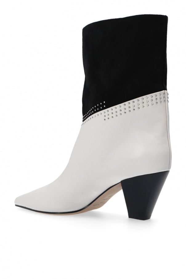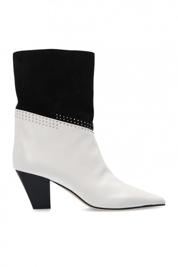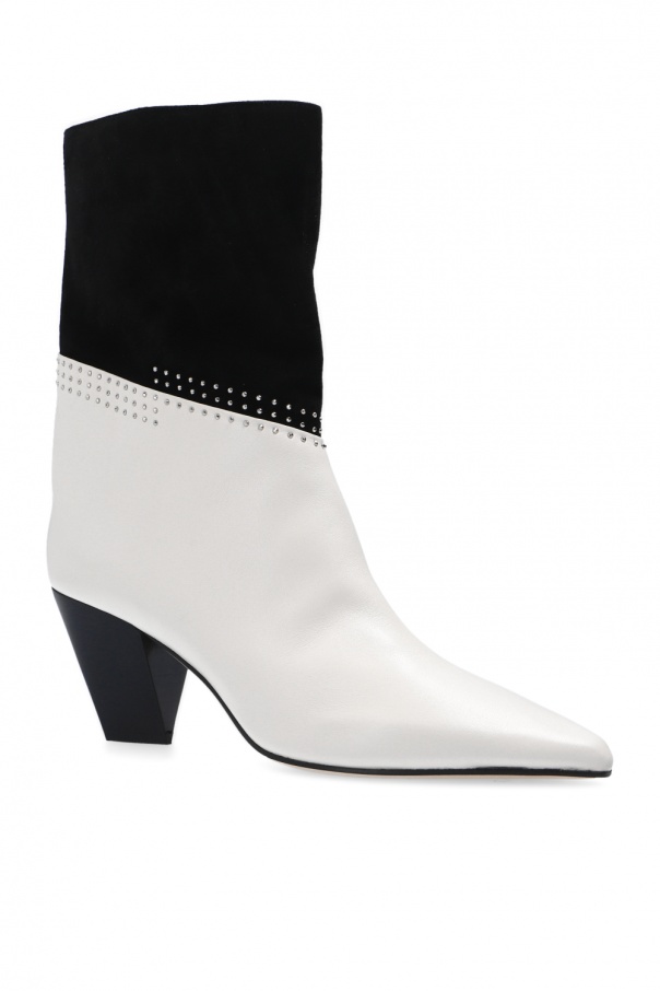 Black and white ‘Bear’ heeled knee-high boots from Jimmy Choo. Punctuated with silver-tone micro-studs, this pair features leather and suede panelled upper and beige rubber-injected leather sole.