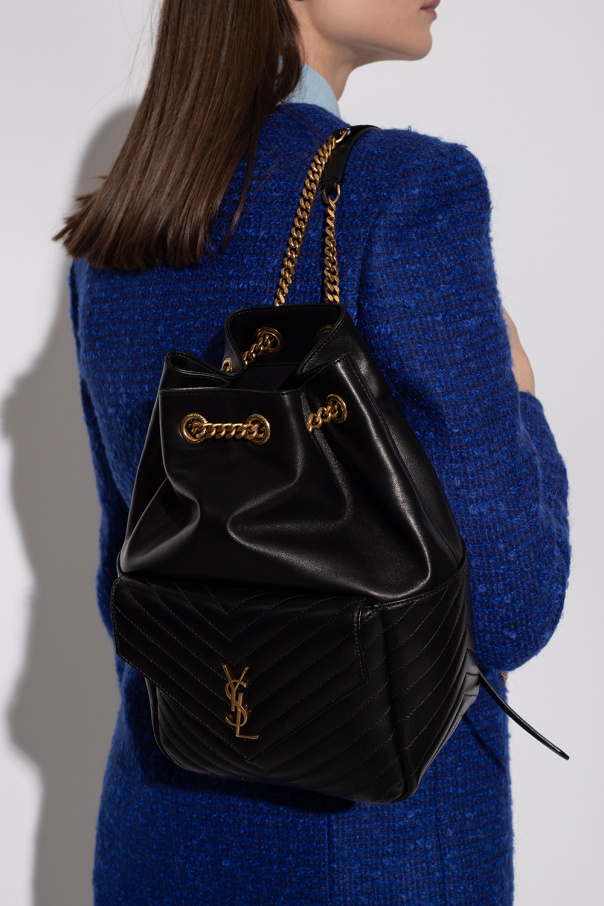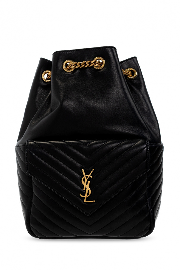 Black ‘Joe’ backpack from Saint Laurent. Made of lamb leather, this design features adjustable drawcords with chain inserts, flap pocket with a magnetic snap closure, metal logo, gold-tone metal hardware and one internal compartment with one zip pocket.