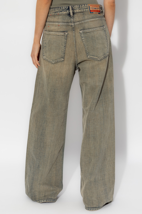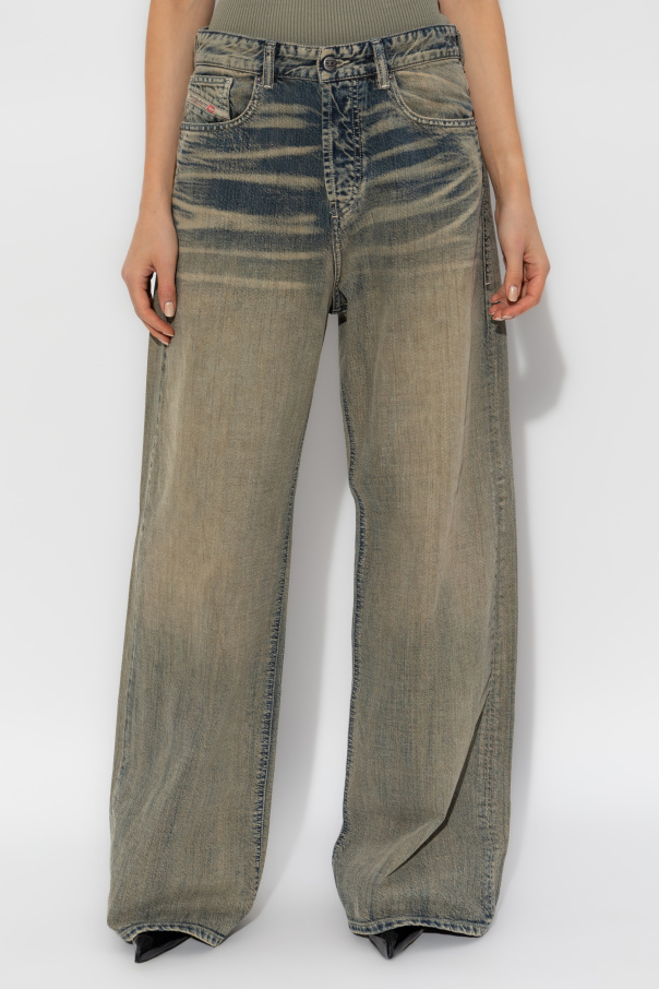 Introducing the Jeans \'1996 D-SIRE\' L.32 from the exalted Diesel collection, a masterpiece in sartorial elegance. Crafted entirely from luxurious cotton, these jeans boast a bootcut silhouette that gracefully widens from the knee down, embodying a relaxed fit with a wide leg. The distinctive beige hue with a faded wash, complemented by deliberate abrasions and shading around the hips and thighs, imparts a chic, vintage allure. This exquisite piece is meticulously fashioned from classic, rigid denim, promising unparalleled quality and longevity. Adorned with the iconic \"Diesel Industry\" patch and brand logo on a petite pocket, alongside the leather logo patch on the rear waistband, these jeans are the epitome of subtle sophistication. The traditional five-pocket design and button-fly closure further enhance their timeless appeal. Why choose this product? Exquisite bootcut design with a modern twist. Uncompromising quality with 100% cotton construction. Signature Diesel detailing for a touch of class. Perfect blend of vintage charm and contemporary style.
