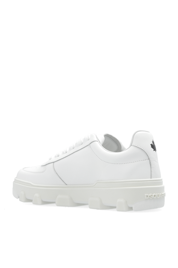 White ‘Icon Basket’ sneakers from Dsquared2. Made from smooth calf leather, this lace-up model sits on a cream rubber sole and showcases a printed green and black logo and perforations on the front.