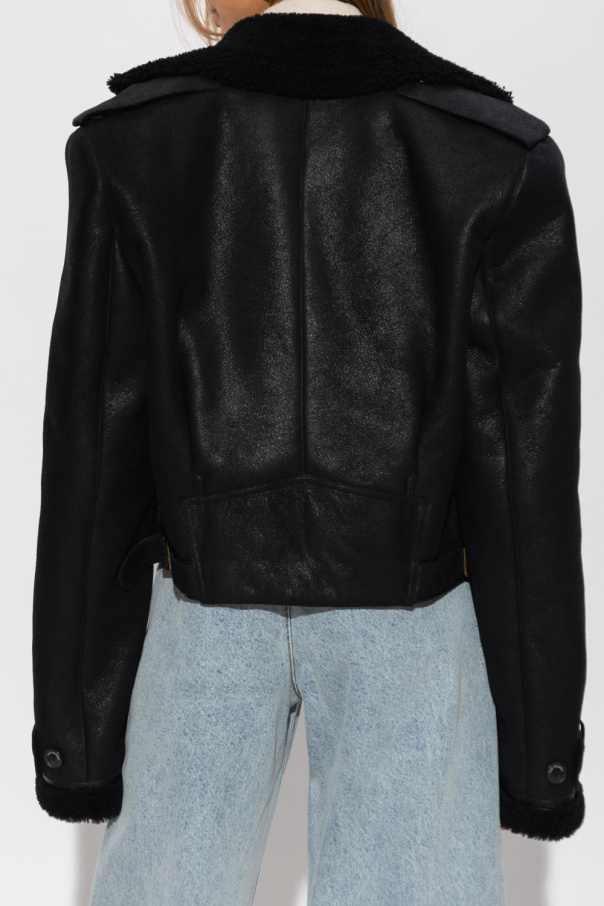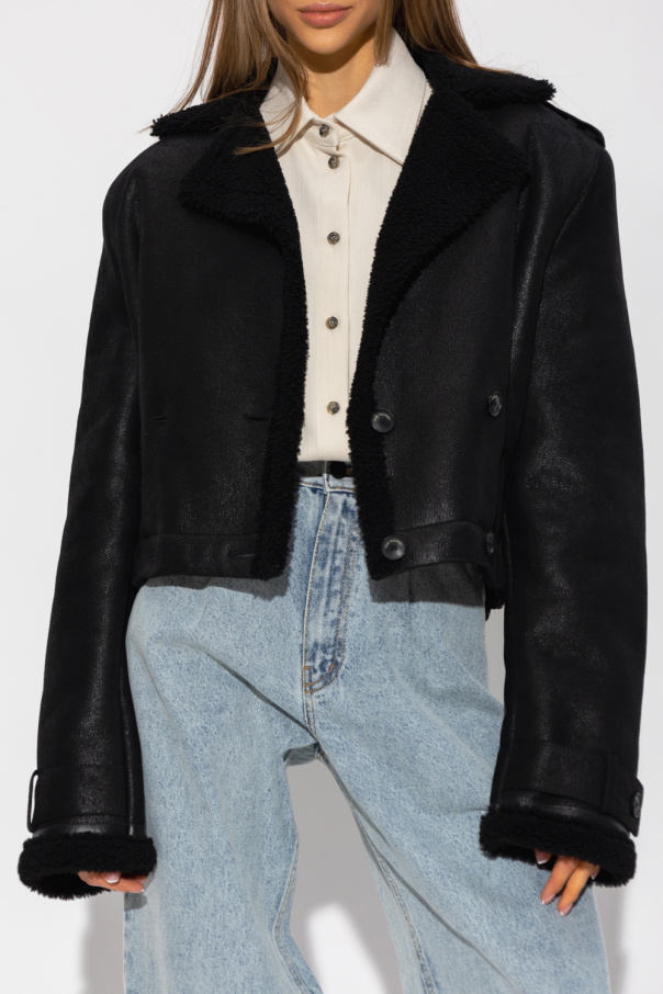 Black ‘Petra’ shearling jacket from The Mannei. Crafted from sheep leather and wool, this style features a cropped, double-breasted silhouette, button fastenings, shoulder epaulettes, long sleeves and side buckle tabs.