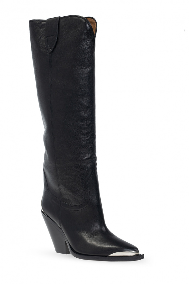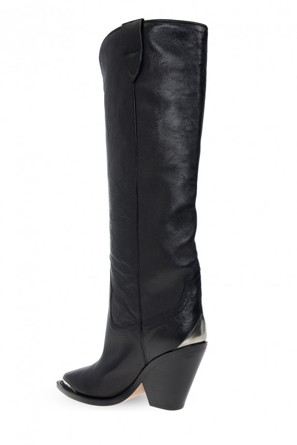 Black ‘Lomero’ heeled boots from Isabel Marant. Made of calf suede, this model features a slip-on silhouette, a pointed toe, a beige leather sole and distinctive stitching details and silver-tone applications.