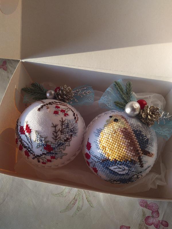 Новорічні вишиті іграшки, діаметр 8 см. ручна робота, вишивка хрестиком та оздоблення декоративними елементами. Вишивка одностороння, задня половинка оксамитова тканина. вартість іграшки з сердечком 350 грн, з білочкою та пташкою 400 грн