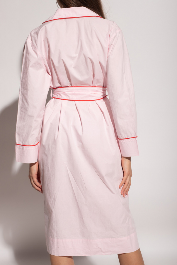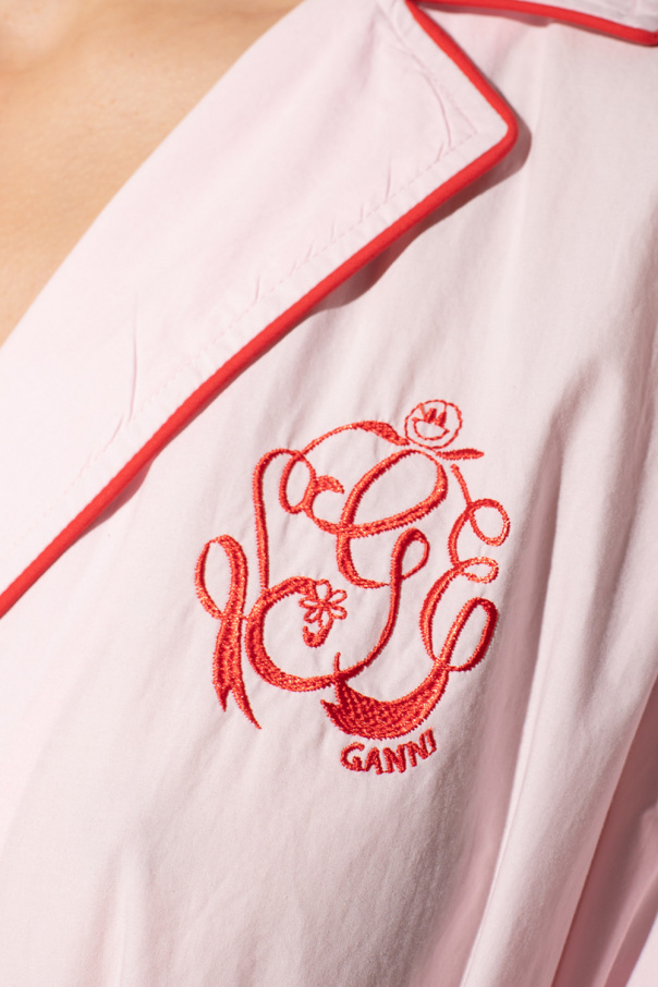 Light pink bathrobe from Ganni. Made of cotton, this garment features a waist belt, red logo embroidery, two front pockets, long sleeves and red trims.
