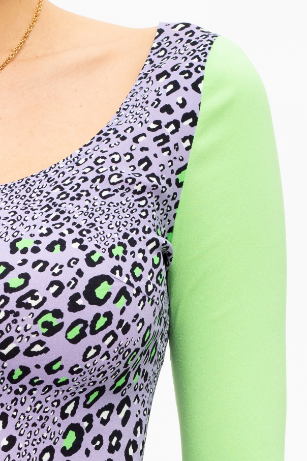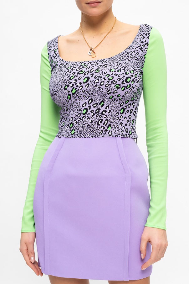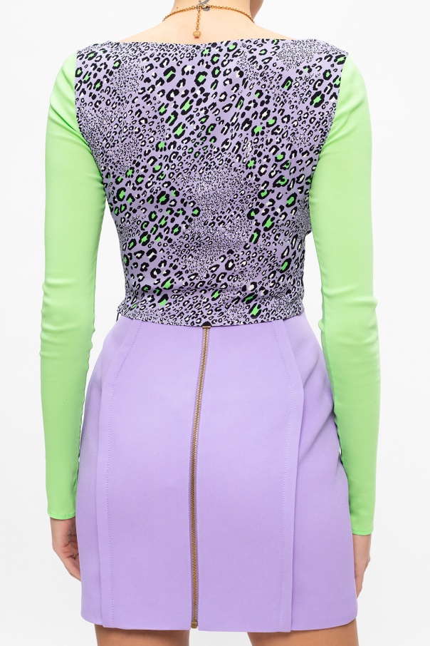 Green and purple top from Versace. Illustrated with black, white and green leopard print, this long-sleeved style is complete with a round neck and side zip fastening.