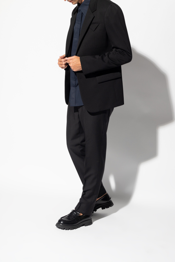 Black moccasins from Alexander McQueen. Crafted from leather, they sit on a black rubber sole and feature decorative stitching and cut-outs.