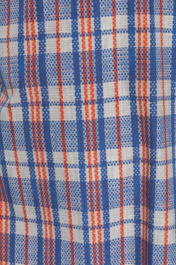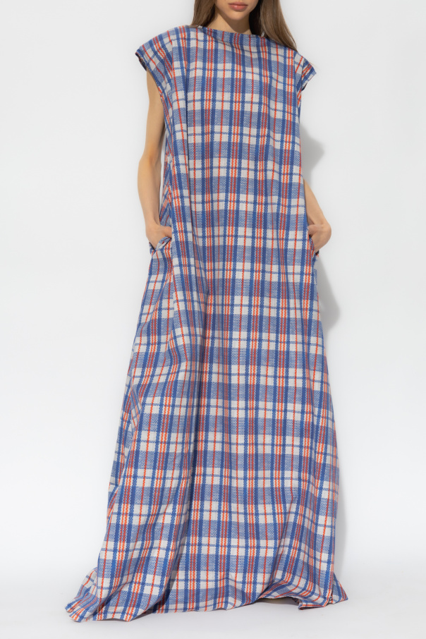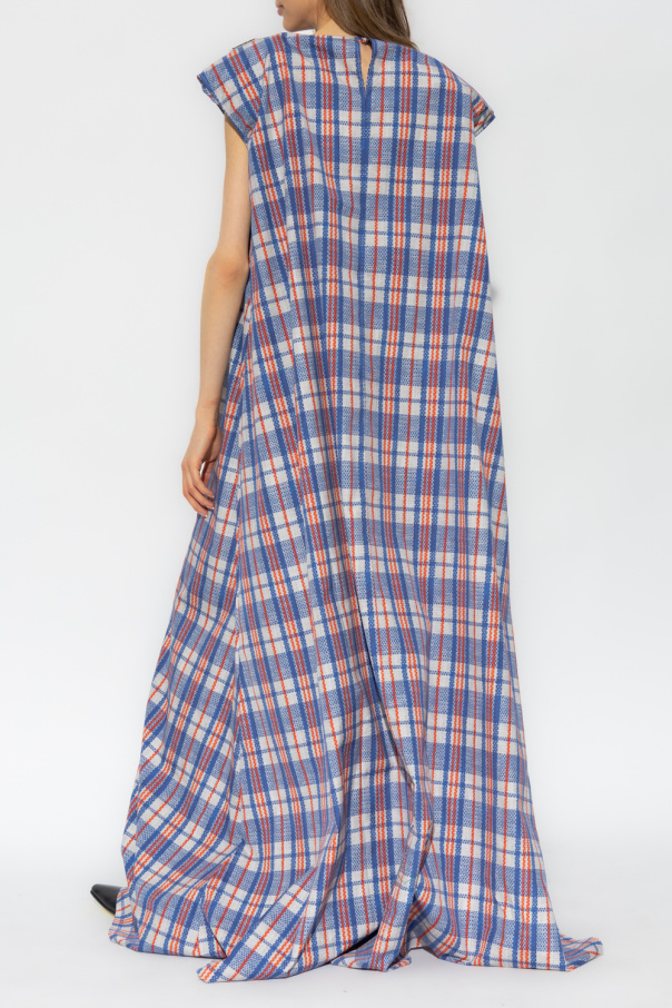 Grey, blue and orange sleeveless dress from VETEMENTS. Made of cotton, this oversize design features button fastenings, a check pattern, rubber logo patch, two slip pockets and detachable shoulder pads.