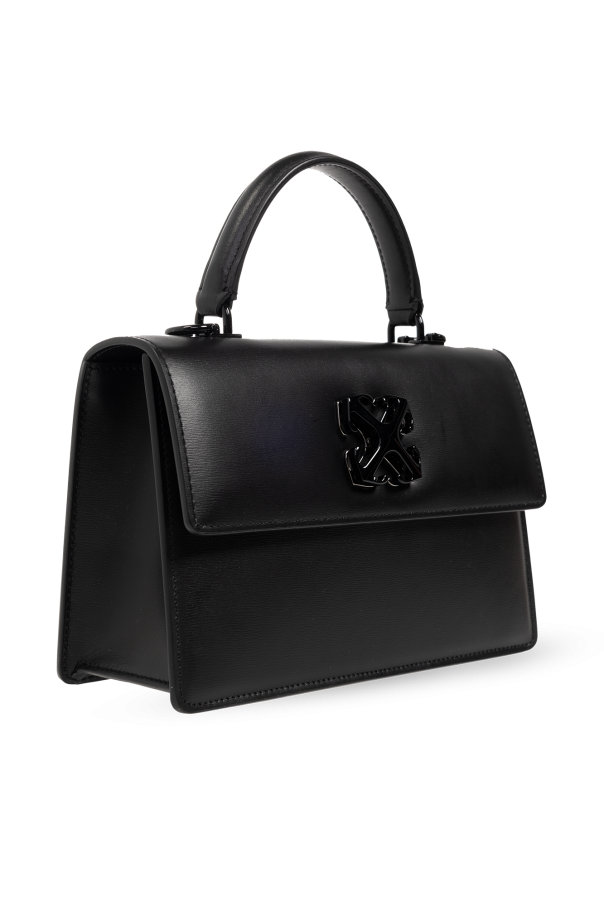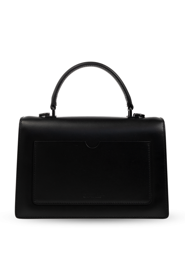 Black ‘Jitney 1.4’ shoulder bag from Off-White. Made of smooth calf leather, this design fastens with a logo-shaped twist snap and features a logo print and one slip pocket on the back, a half-round handle, a detachable and adjustable shoulder strap, black metal hardware and a maroon-clad interior with one compartment with one zip pocket, one slip pocket and one card slot.