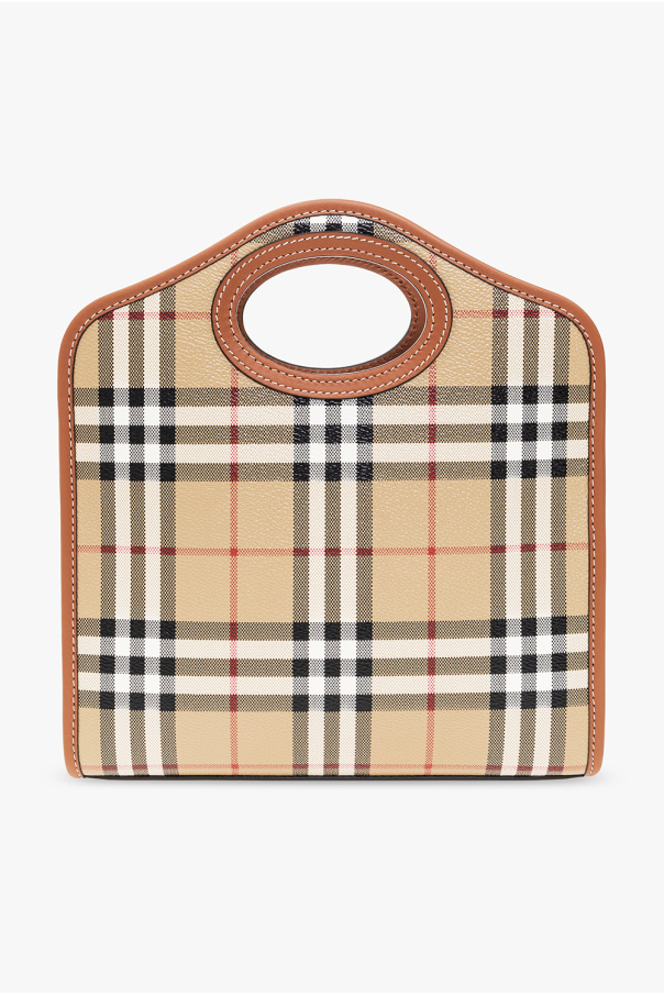 Beige and brown ‘Pocket Mini’ shoulder bag from Burberry. Made of coated canvas with calf leather trims, this design features the brand’s signature multicolored check pattern, snap-fastened front pocket with a logo print, two handles, detachable and adjustable shoulder strap, gold-tone metal hardware and one internal compartment with one zip pocket.