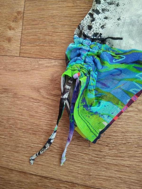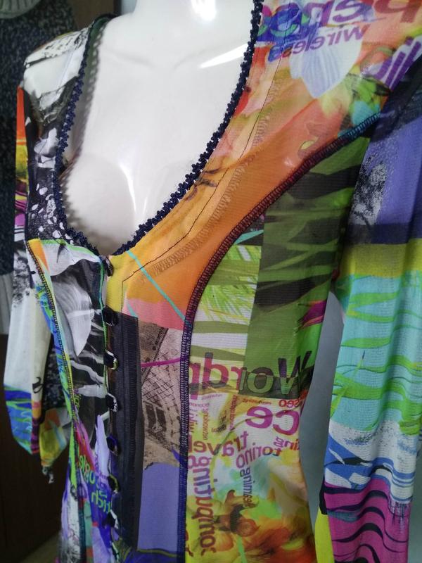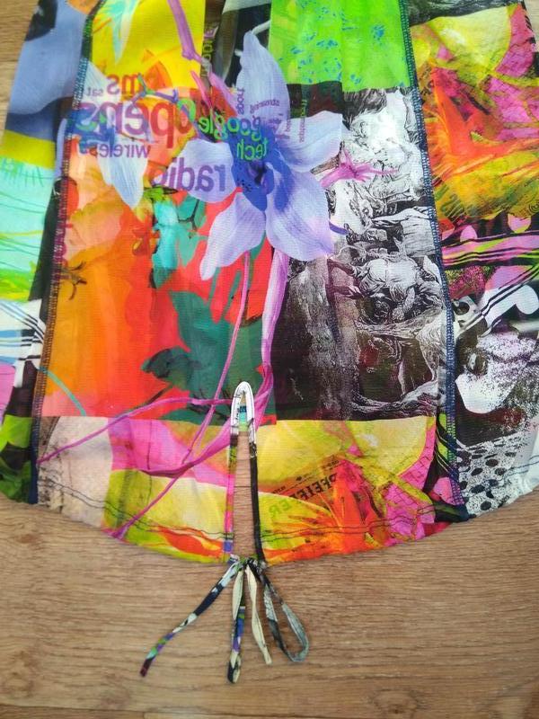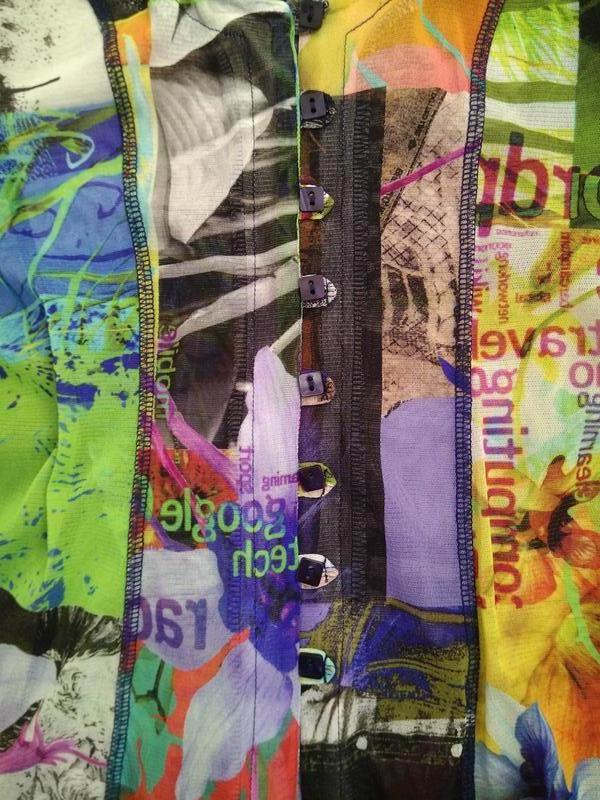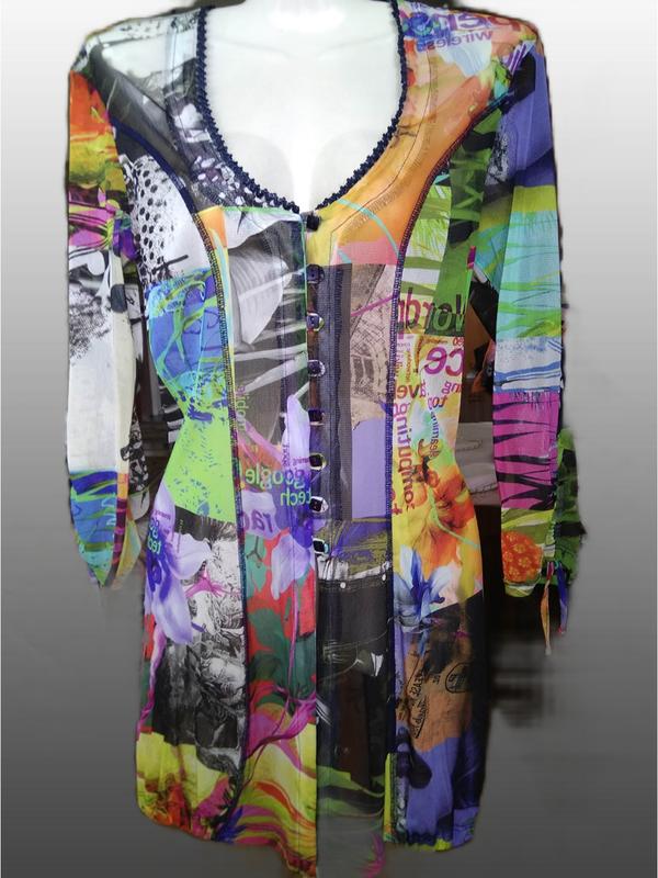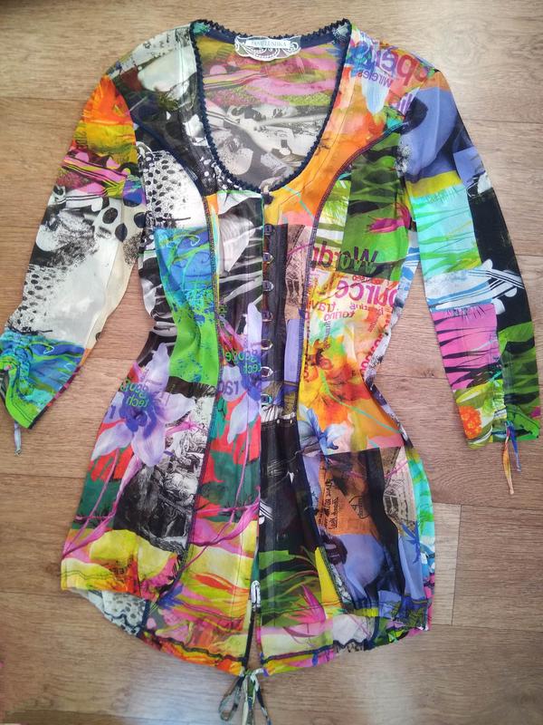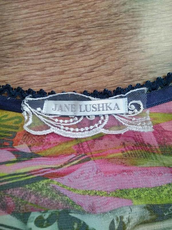 Голландский модный бренд Jane Lushka (Амстердам) производит удобную качественную одежду для сильных и уверенных в себе женщин всех возрастов и профессий, которые стремятся выглядеть стильно и женственно в любых ситуациях. Модели производятся из экологически чистых тканей из Италии, сертифицированных и произведенных исключительно в Европе. Очень яркая комфортная удлинённая блуза (рубашка туника) jane lushka с 3/4 рукавом популярного голландского бренда jane lushka. Ткань прозрачная стрейчевая, прекрасно сидит, не парит, слегка сетчатая. Романтичный фасон - полуприталенный. Спинка длиннее переда, ширина низа регулируется завязками, разрез по центру низа спинки завязывается на бантик. Перёд застёгивается на стильные квадратные синие перламутровые пуговки. Рукава присобраны внизу завязочками Принт - экзотические цветы, надписи, фрагменты картин. Просто произведение искусств! Шикарно смотрится с джинсами, брюками и шортами всех цветов. Можно носить как летнюю курточку на топик. Длина спинки 87 см, переда 79 см Длина рукава 49 см ПОГ 50 см ПОТ 44 см ПОБ 58 см Плечи по спинке 46 см Ткань хорошо тянется, возможно, легко сядет и на большие на пару см размеры. Блуза не мнётся, в глажке практически не нуждается. Не маркая. Прекрасная эффектная блуза на все случаи жизни. Состояние идеальное. Без нюансов.