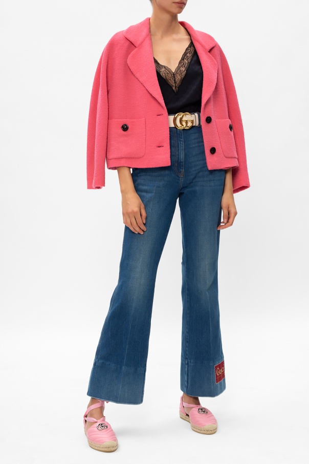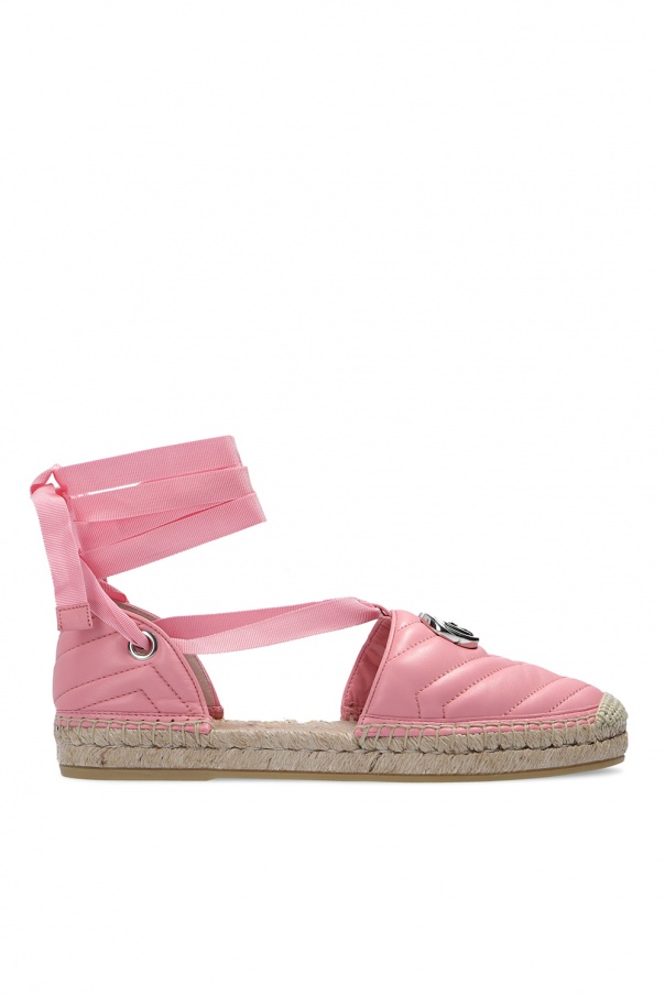 Pink quilted espadrilles from Gucci. This pair is fastened around the ankle, set on a brown rubber sole with woven details and features a silver-tone Double G detail.