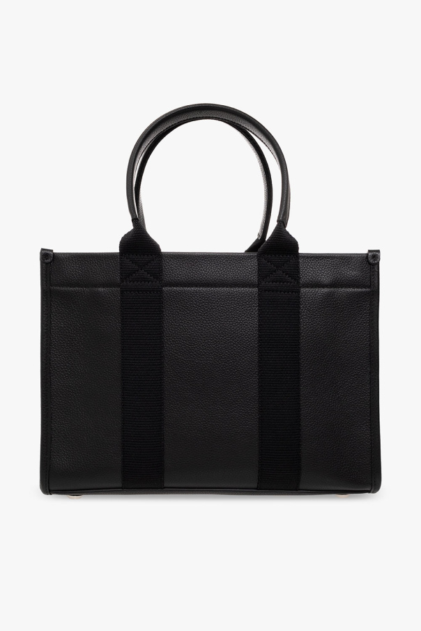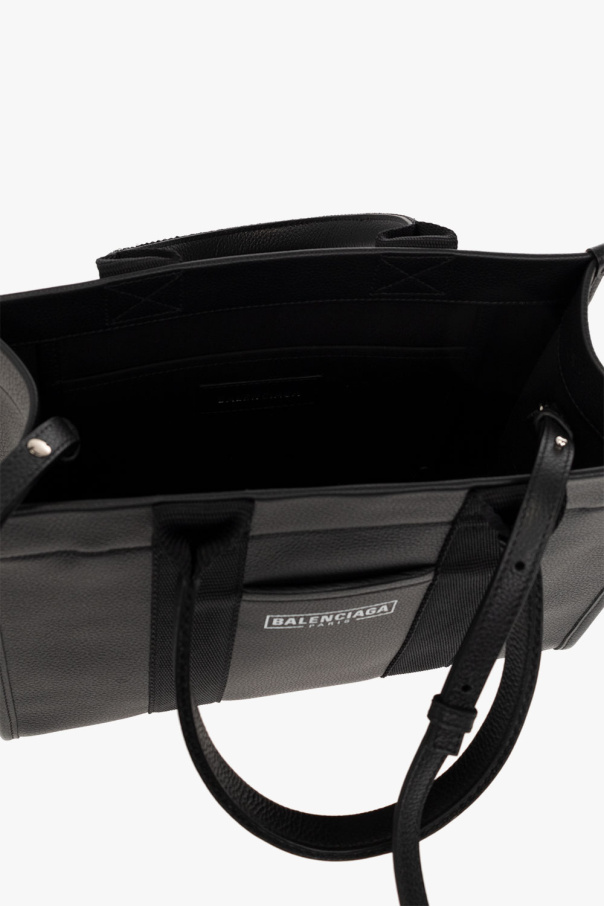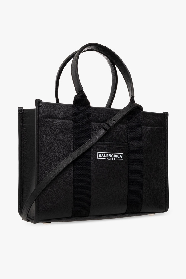 Black ‘Hardware’ shopper bag from Balenciaga. Crafted from leather, this design features a slip front pocket printed with a white logo, two half-round handles, a detachable shoulder strap and one internal compartment with one slip pocket and one zip pocket.