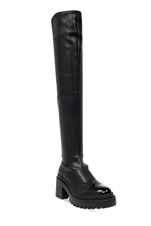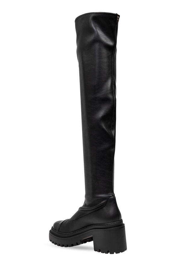 Introducing the epitome of sophistication and allure, the \"Martini\" over-the-knee boots by the renowned designer Giuseppe Zanotti. Crafted with meticulous attention to detail, these boots are a testament to elegance and cutting-edge fashion. The dominant black hue enhances the sleek and seamless design, making these boots a versatile addition to any wardrobe. Constructed from the finest leather, both inside and out, the \"Martini\" boots exude luxury from every angle. The high-shine finish of the leather adds a touch of glamour, while the chunky, rubber platform heel ensures stability and comfort, allowing for confident strides. The rounded toe silhouette maintains a classic appeal, updated with a contemporary twist for the modern woman. Notably, the boots feature a subtle closure system, which complements their minimalist aesthetic. The absence of visible branding underscores the sophistication of the design, focusing purely on the quality and style of the product. Why purchase the \"Martini\" boots? Exclusive Design: Designed by Giuseppe Zanotti, these boots are a blend of traditional craftsmanship and modern aesthetics. Luxurious Materials: High-quality leather construction ensures durability and a plush feel. Comfortable Wear: The rubber platform and well-designed heel offer both height and comfort. Versatile Style: The classic black color and sleek design make these boots suitable for a range of occasions. Subtle Elegance: With no overt branding, these boots speak volumes with their understated elegance.