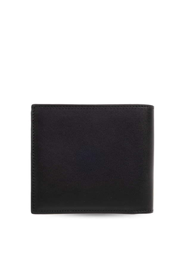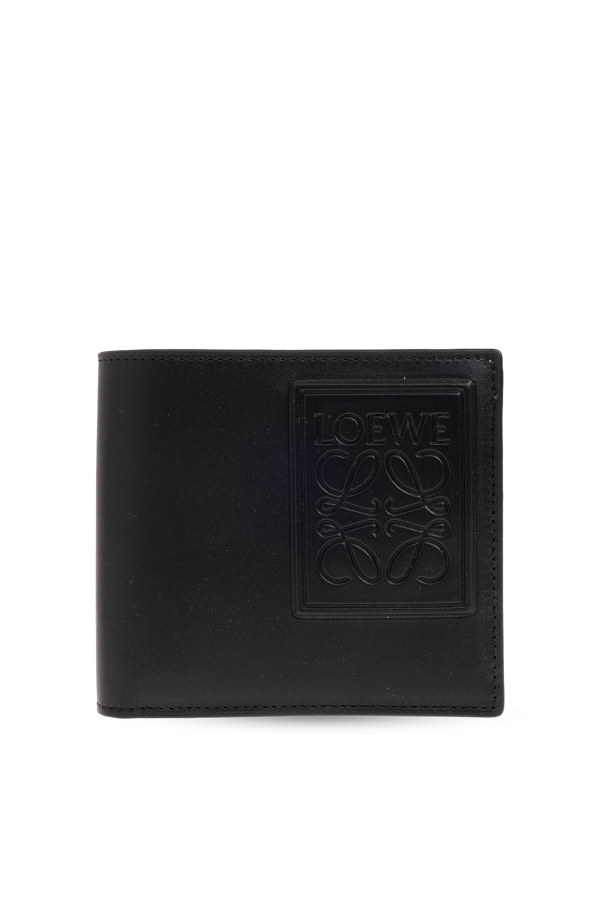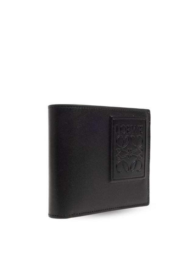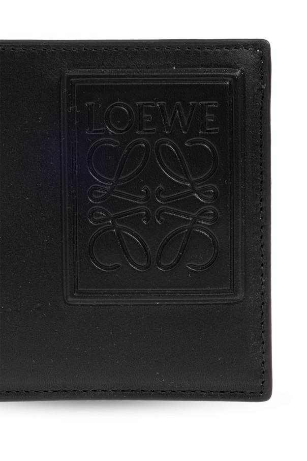 Black folding wallet from Loewe. Made from calf leather, this item showcases a logo-embossed application on the front as well as two bill compartments, two slip pockets, one snap-fastened coin pocket and four card slots inside.