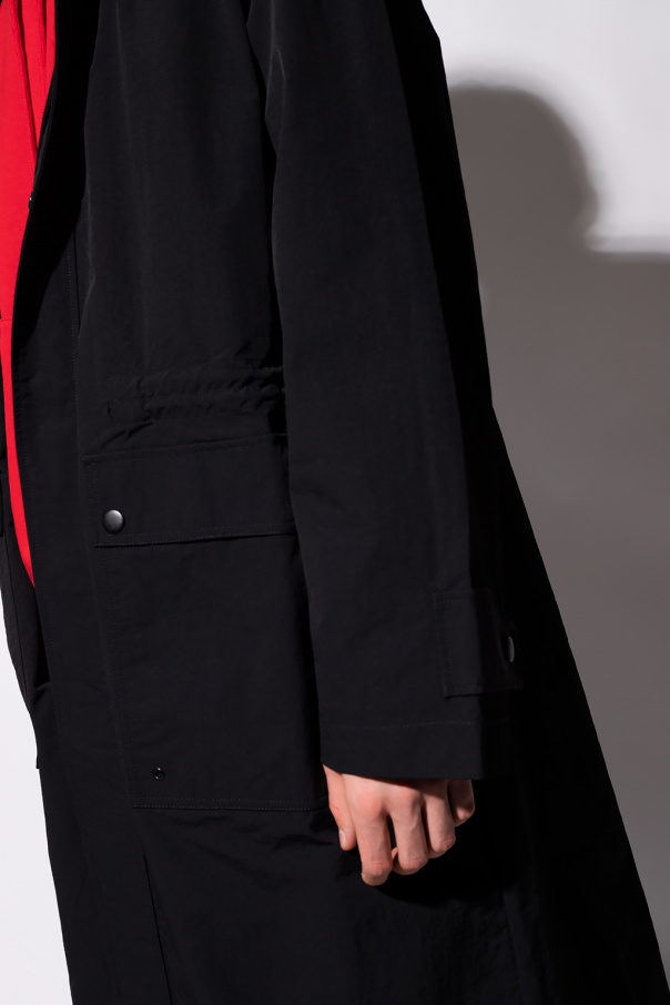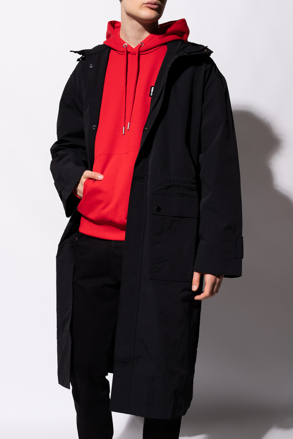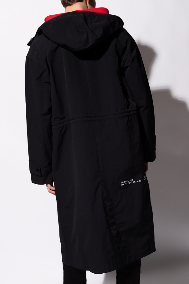 Black rain coat from Diesel. Fastened with snaps, this design features a drawstring hood, two slip pockets, two snap-fastened flap pockets, long sleeves, white logo printed at the back and a single rear vent.