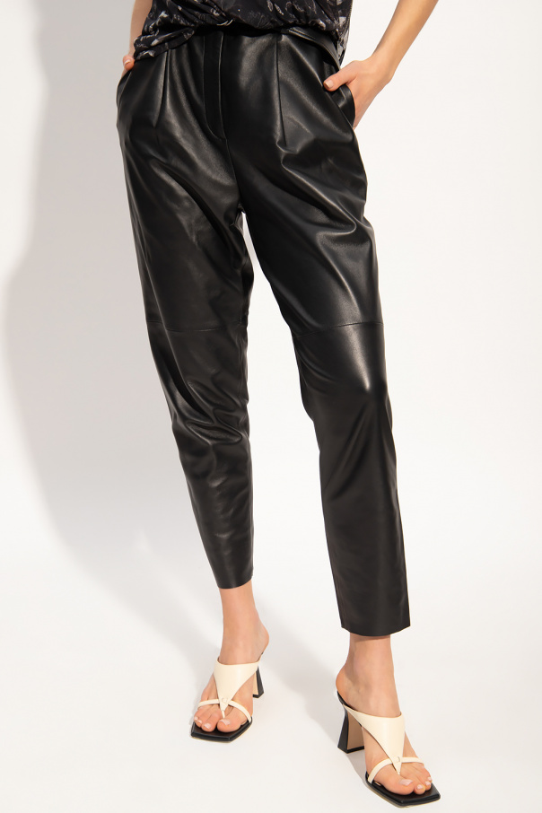 Black ‘Lana’ trousers from AllSaints. Crafted from lamb leather, this pair falls down with slightly tapered legs and features a zip fly, hook & eye closures, a belt with a silver-tone buckle and four slip pockets throughout.