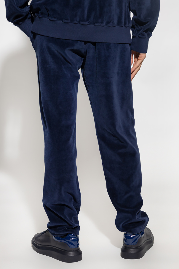 Navy blue ‘Marcoh’ sweatpants from MARANT. Rendered in velvet fabric, this pair falls with slightly tapered legs and features a drawstring waistband, three slip pockets and an embroidered logo on the front.