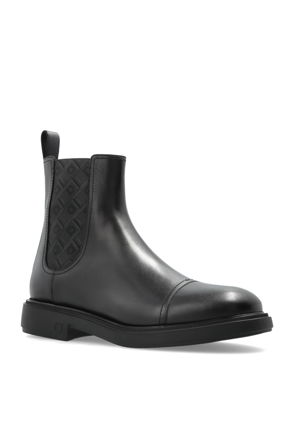 Introducing the exquisite Beat Chelsea Boots from the exclusive FERRAGAMO collection, a testament to timeless elegance and unparalleled craftsmanship. Crafted from smooth, premium leather, these black, classic Chelsea boots feature a sophisticated rounded toe and a high ankle silhouette. The boots are adorned with elastic side panels showcasing a decorative geometric pattern, enhancing both style and ease of wear. A convenient pull tab graces the heel, while subtle stitching adds an extra layer of refinement. Designed for comfort and durability, the solid flat sole ensures a stable stride, while the wide insole, embossed with the iconic \"Ferragamo\" logo, provides an extra touch of grandeur. These boots seamlessly transition from formal to semi-formal settings, embodying minimalist elegance. Why Choose This Product? Luxurious design from renowned brand FERRAGAMO. High-quality leather for long-lasting wear. Comfortable extrawide insole for enhanced fit. Versatile style suitable for various occasions.