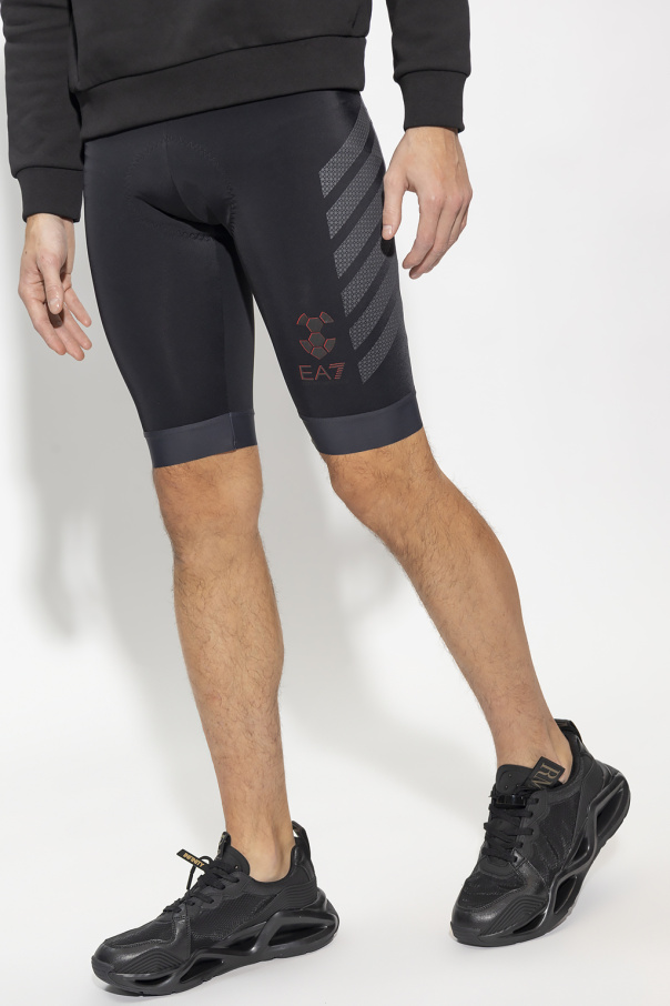 Black bike shorts from EA7 Emporio Armani. Crafted from flexible technical VIGOR7 material designed to provide support during sporting activities, this design features a print, logo, zipped back pocket and foam insert.