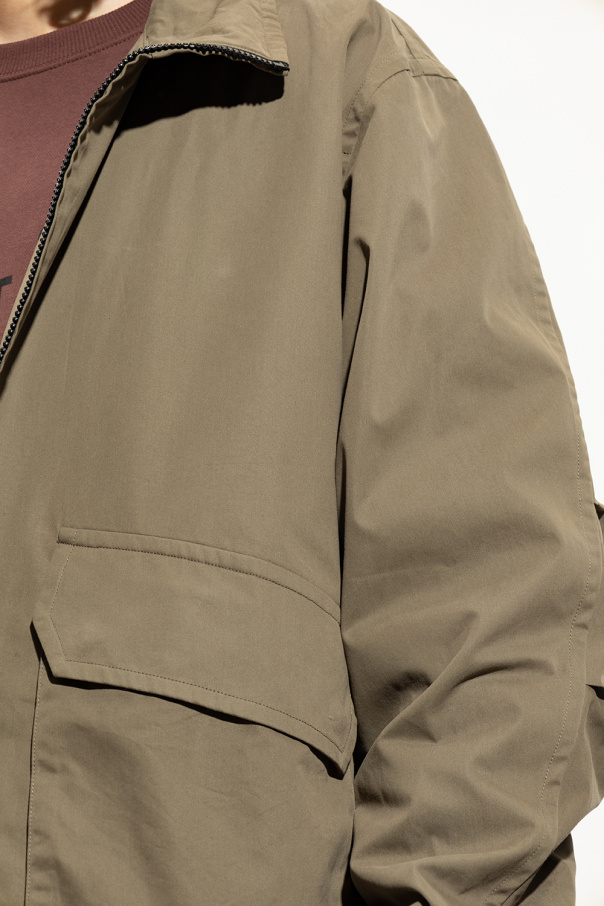 Khaki jacket with a collar from Helmut Lang. Crafted from cotton, this item fastens with a zipper and features a drawcord-adjustable hem, four frontal pockets (two with snap-fastened flaps) and long sleeves with black elastic trims.