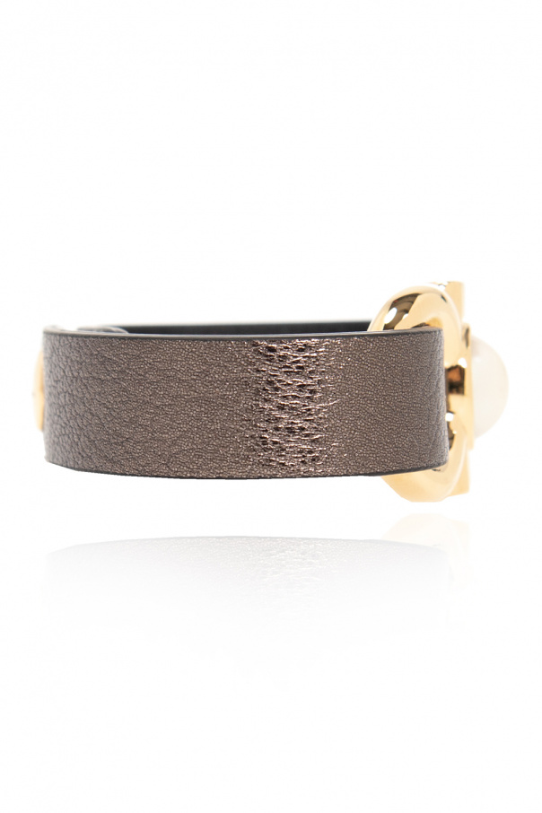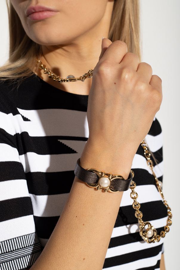 Dark brown bracelet from Salvatore Ferragamo. Made of calf leather, this item secures with an adjustable snap closure and features a metallic finish, a white glass pearl and brass Gancini hardware.