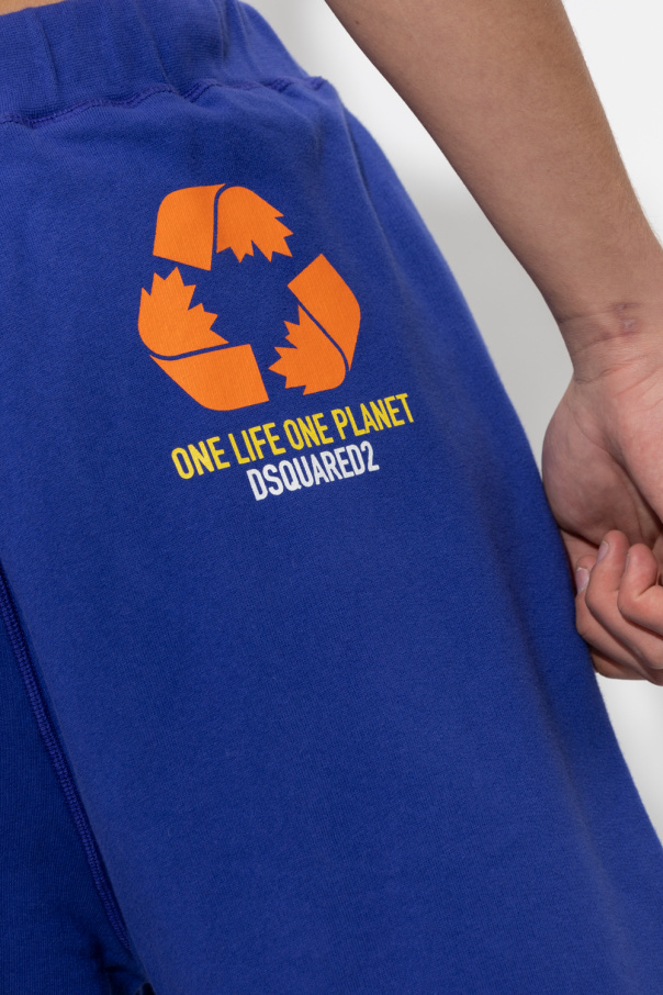 Blue shorts from Dsquared2, the ‘One Life One Planet’ capsule collection. Crafted from recycled organic cotton, this pair features an elasticated waistband, two slip pockets and an orange, yellow and white logo print at the back.