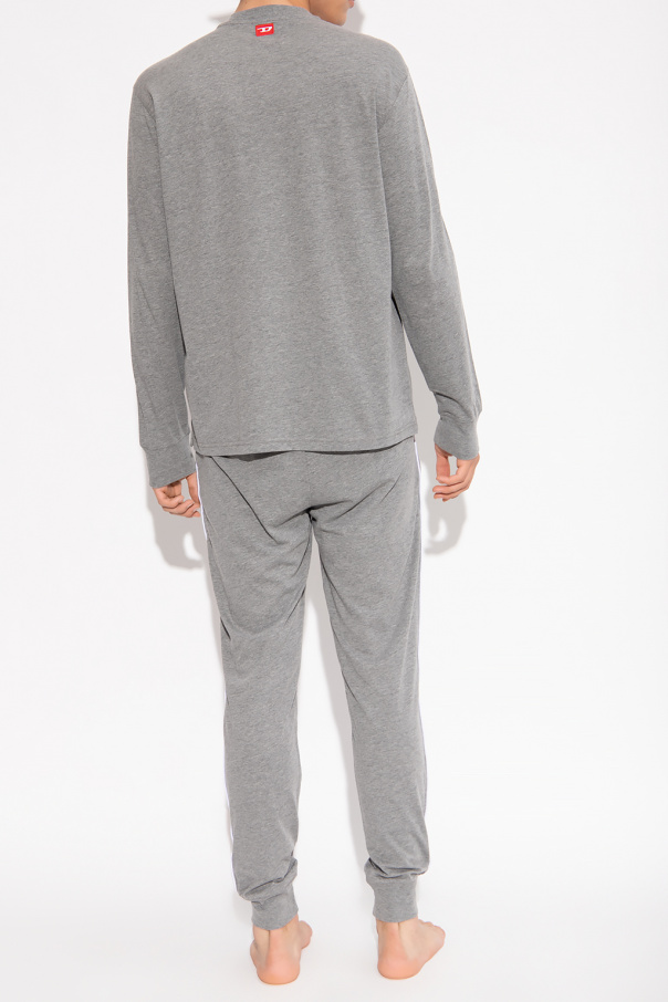 Grey ‘UMSET-WILLYPER’ two-piece pyjama from Diesel. Made of a cotton blend, it includes a crewneck T-shirt with long sleeves with ribbed edges and white stripes at the shoulders as well as long trousers with an elastic waistband, red inserts on the sides, two pockets, logo patch, white stripes and ribbed cuffs.