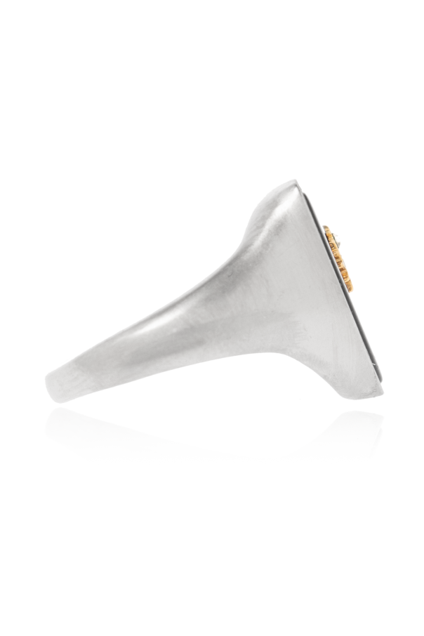 Silver-tone ring from Maison Margiela. Made of brass, this item features a swirled pattern on the sides and black central stone with a crystal detail.