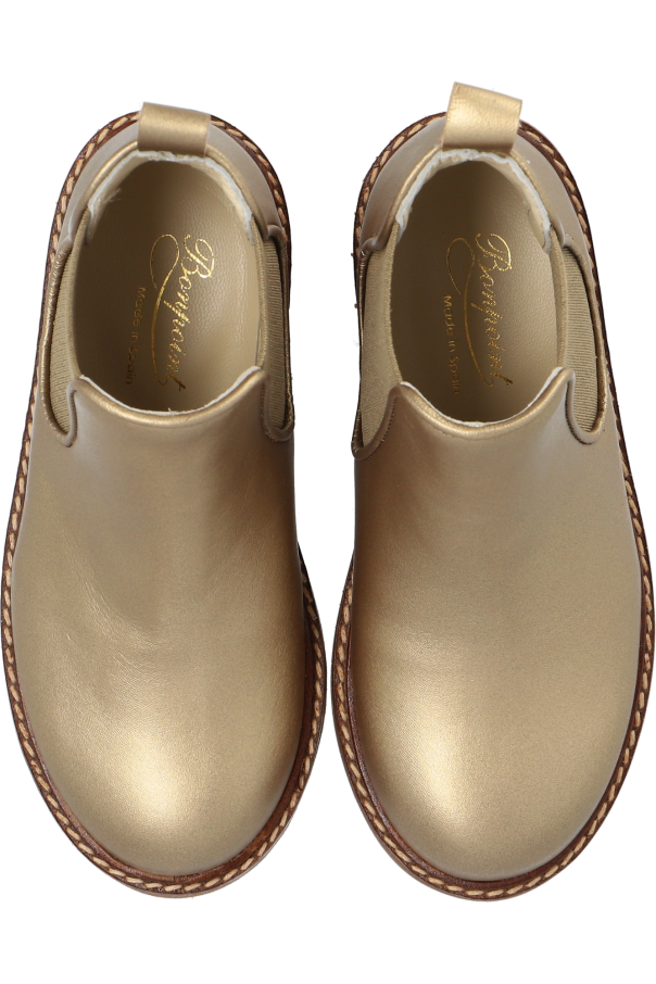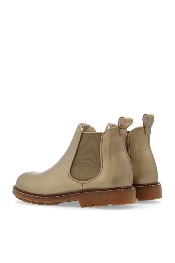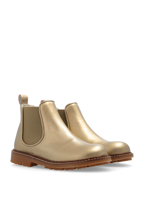 Gold-tone ‘Mathis’ ankle boots from Bonpoint. Made from leather with a slip-on silhouette, this model sits on a brown rubber sole and features a round toe and elastic panels on the sides.