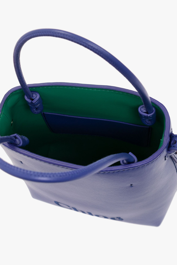 Blueish purple ’Chloé Sense Micro’ shoulder bag from Chloé. Crafted from calf leather, this design showcases an embroidered logo on the front. It is complete with a long and adjustable shoulder strap, two half-round handles, gold-tone metal hardware and a green-clad interior with a slip pocket.